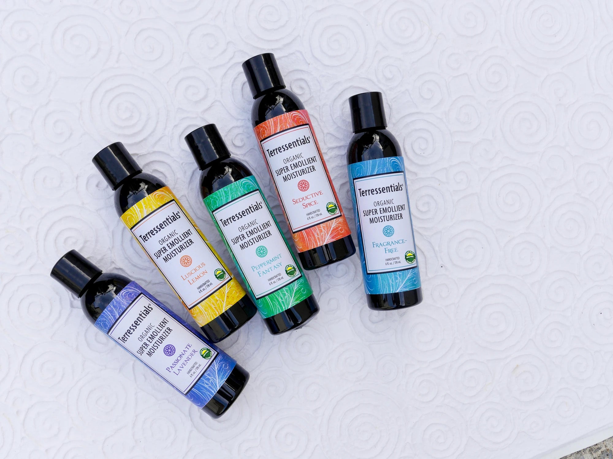Terressentials Super Emollient Moisturizers are unique liquid balms—thick and rich with silky, aromatic certified organic cocoa butter suspended in golden, skin-softening certified organic sunflower and coconut oils. Our certified organic virgin coconut oil is infused with certified organic angelica, calendula, centella asiatica and chamomile in a slow, gentle, process that yields an amazing organic blend to soothe dry or chapped skin and to help keep your natural moisture in your skin.